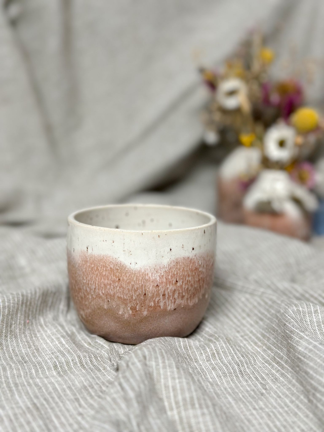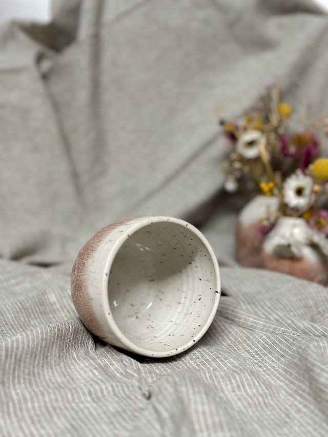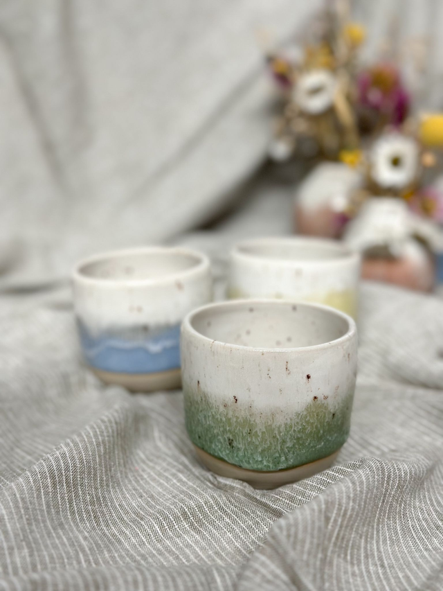Handgefertigter Keramikbecher aus Steinzeug. Im oberen Bereich und innen weiß-glänzende Glasur, im unteren Bereich matte Glasur gelb/hellblau/hellgrün/lachsrosa). Ton ohne Spots.