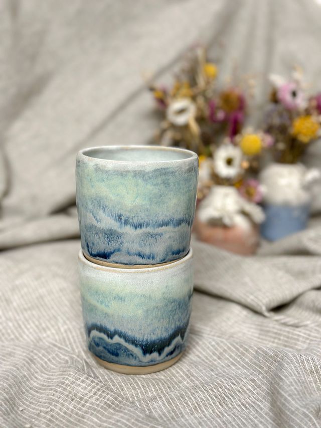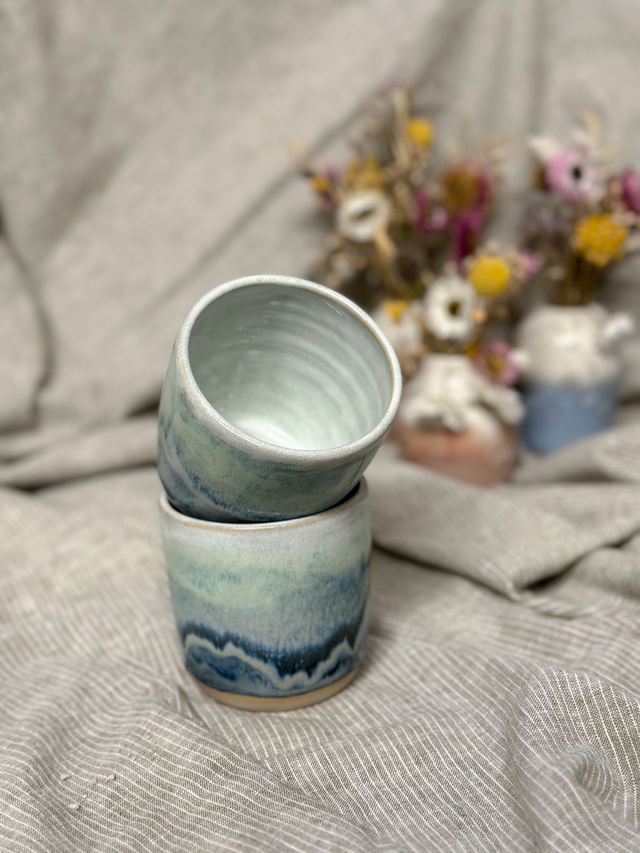 Handgefertigter Keramikbecher aus Steinzeug mit wunderschönem Grün-Blauverlauf.