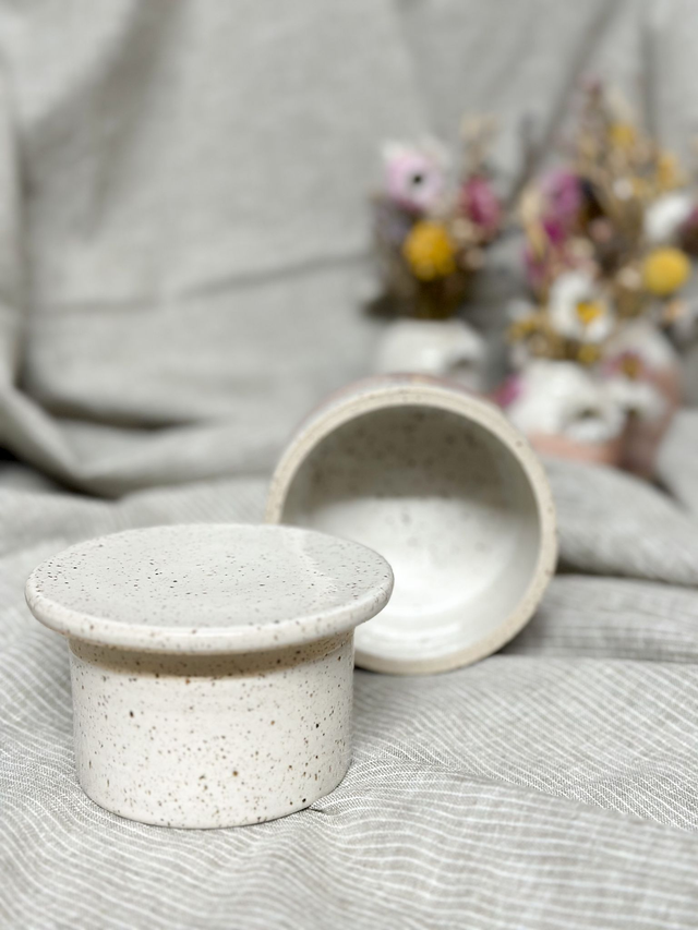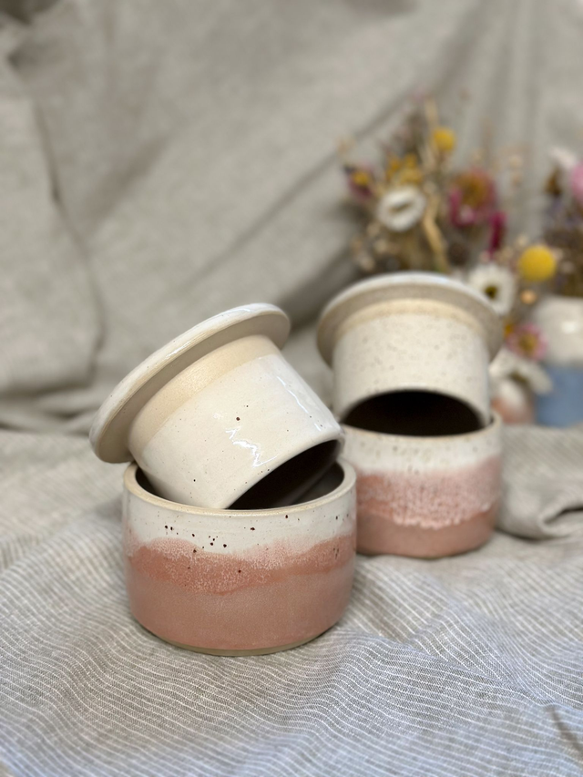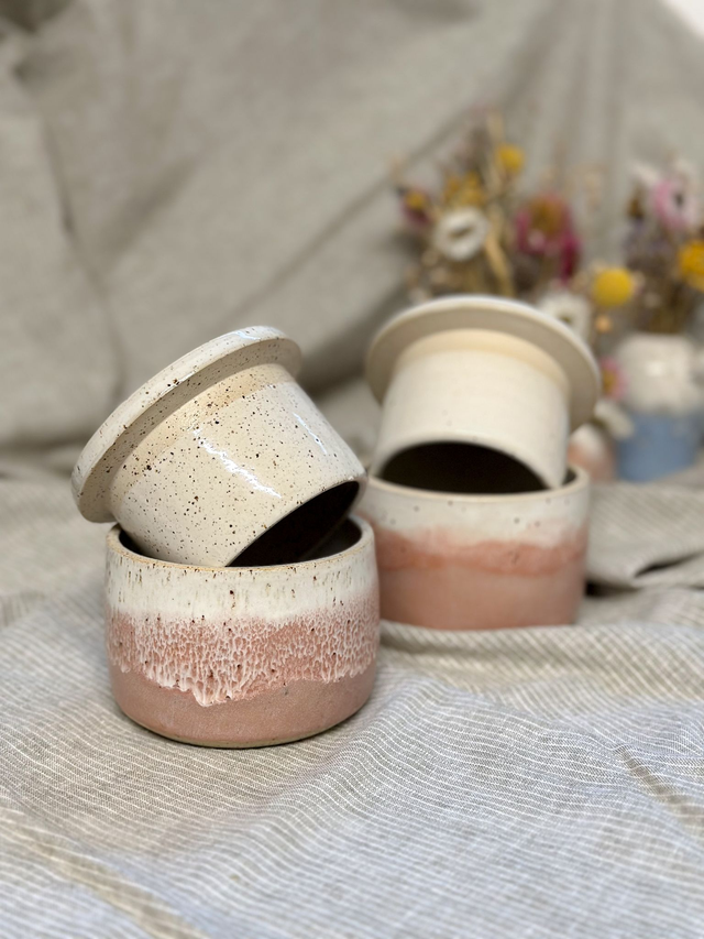 Handgefertigte französische Butterdose aus Steinzeug – oben und innen weiß gesprenkelt, unten matt lachsfarben. Die Dose hält Butter außerhalb des Kühlschranks frisch und streichzart: Die Butter wird in die obere Glocke gestrichen, das Unterteil mit etwas Wasser gefüllt und beides ineinandergesetzt – so entsteht ein natürlicher, luftdichter Abschluss.