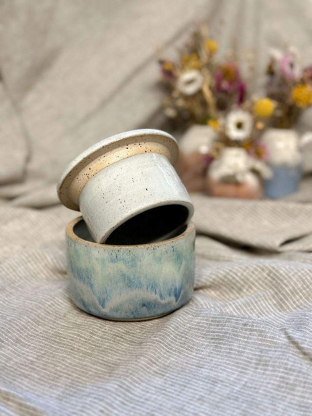 Handgefertigte französische Butterdose aus Steinzeug mit wunderschönem grün-blauen Farbverlauf. Die Dose hält Butter außerhalb des Kühlschranks frisch und streichzart: Die Butter wird in die obere Glocke gestrichen, das Unterteil mit etwas Wasser gefüllt und beides ineinandergesetzt – so entsteht ein natürlicher, luftdichter Abschluss.