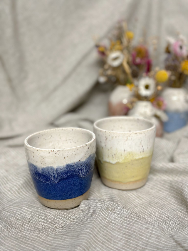 Handgefertigter Keramikbecher aus Steinzeug. Im oberen Bereich und innen weiß-glänzende Glasur, im unteren Bereich strahlend gelbe / dunkelblaue Glasur. Ton mit Spots.
