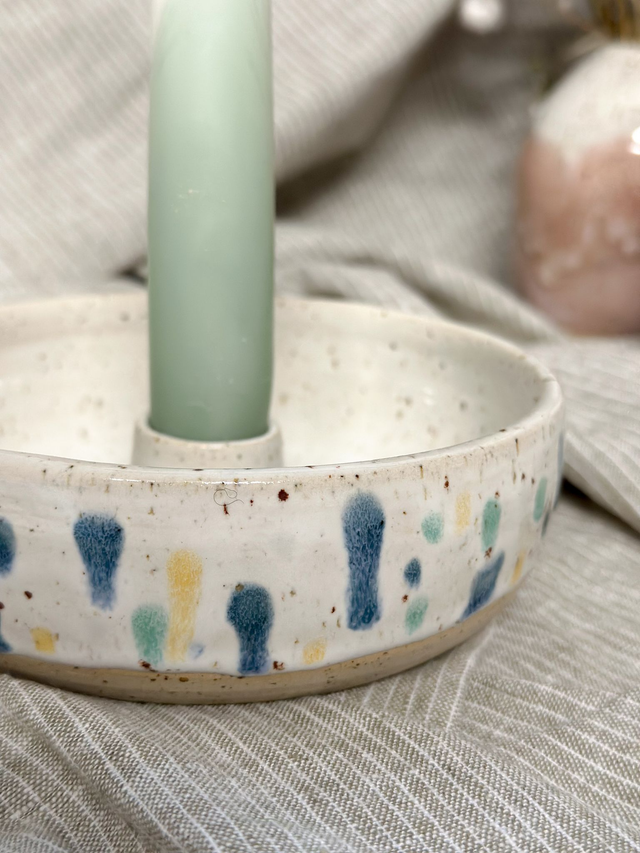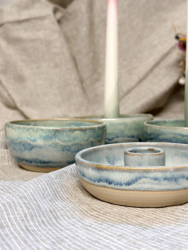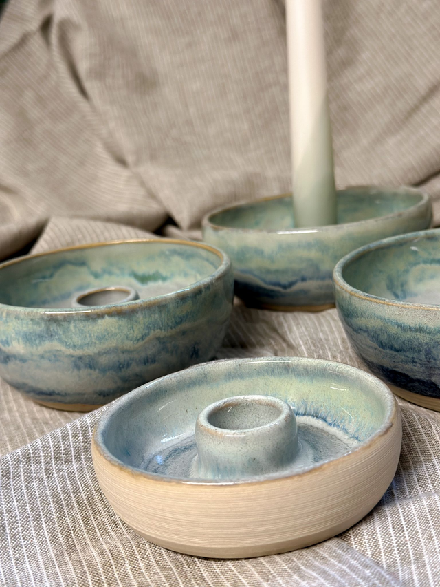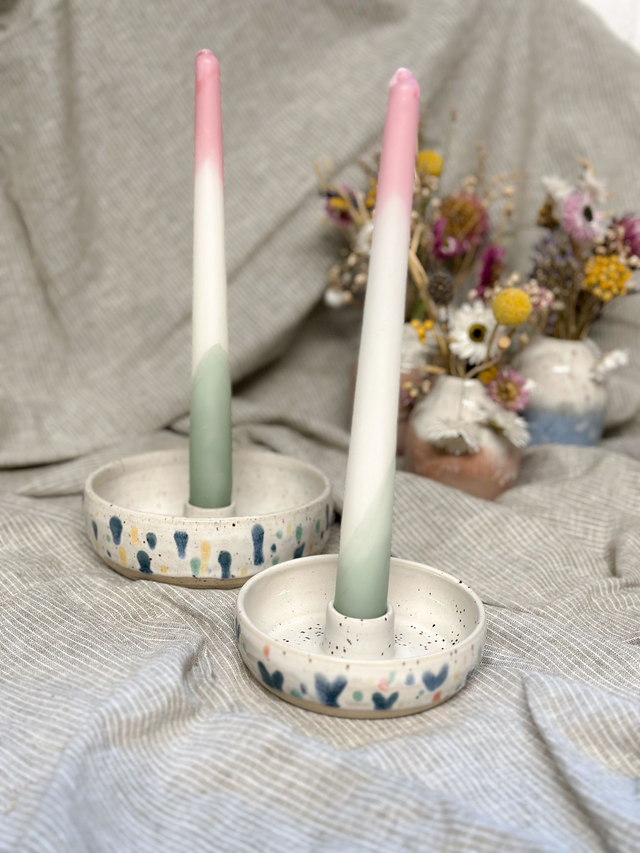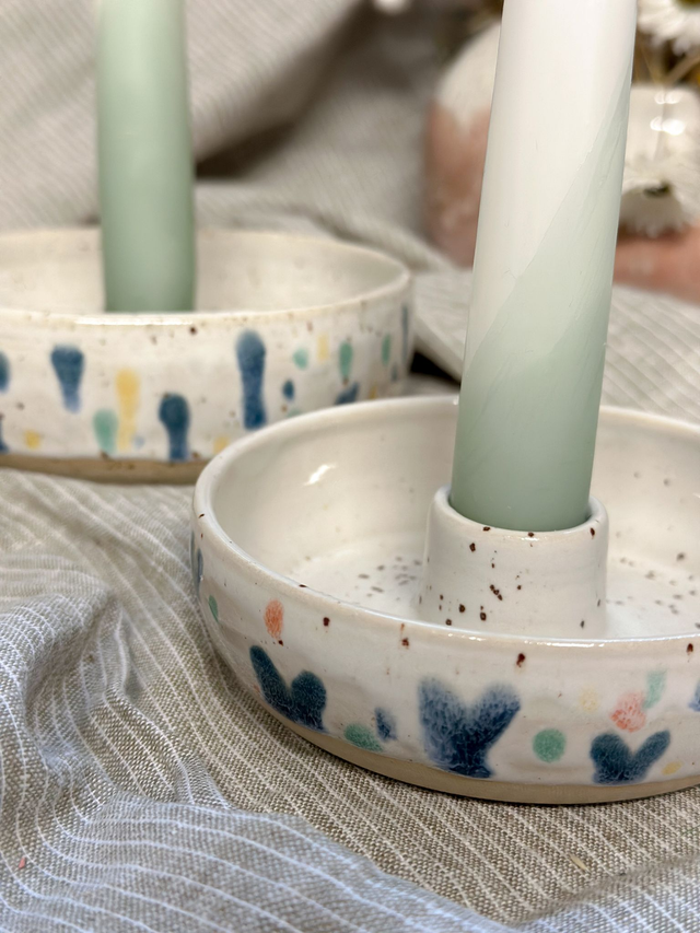 Handgefertigte Kerzenhalter aus Steinzeug mit wunderschönem grün-blauen Farbverlauf bzw. Punkte- oder Herzmuster.