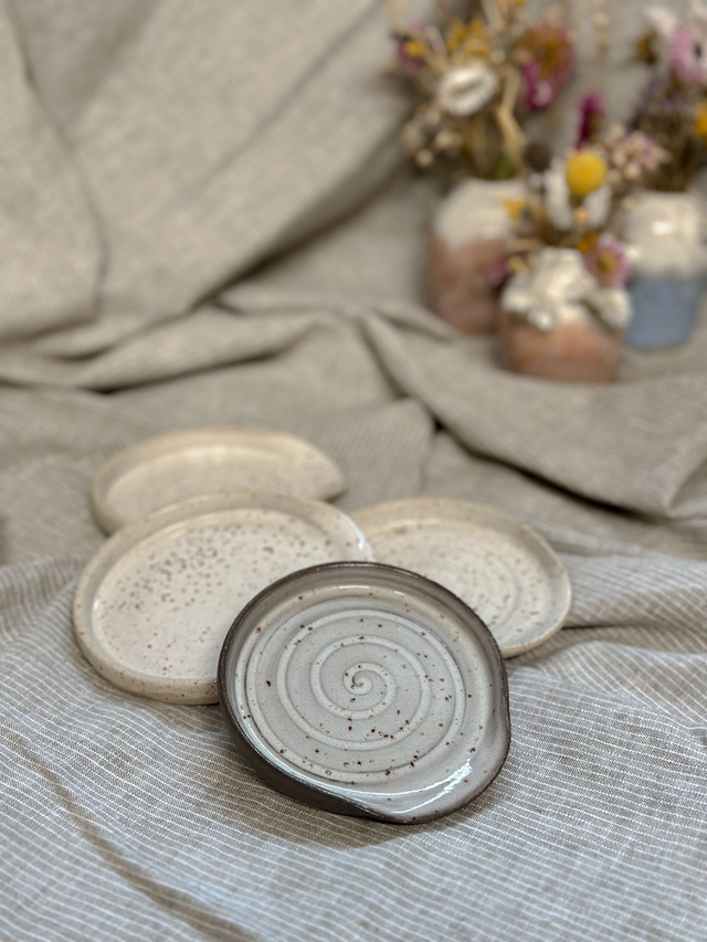 Handgefertigte Kochlöffelablage aus Steinzeugton mit oder ohne Spots. Die Glasur betont die natürliche Struktur des Tons und verleiht dem Stück einen ruhigen, modernen Look. Die Ablage bietet ausreichend Platz für Kochlöffel, Pfannenwender oder kleine Küchenutensilien und hält die Arbeitsfläche sauber.