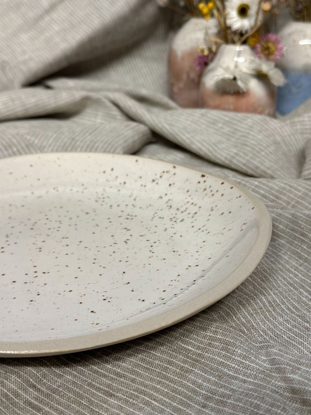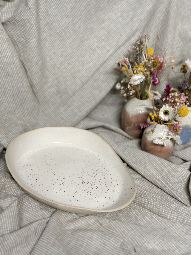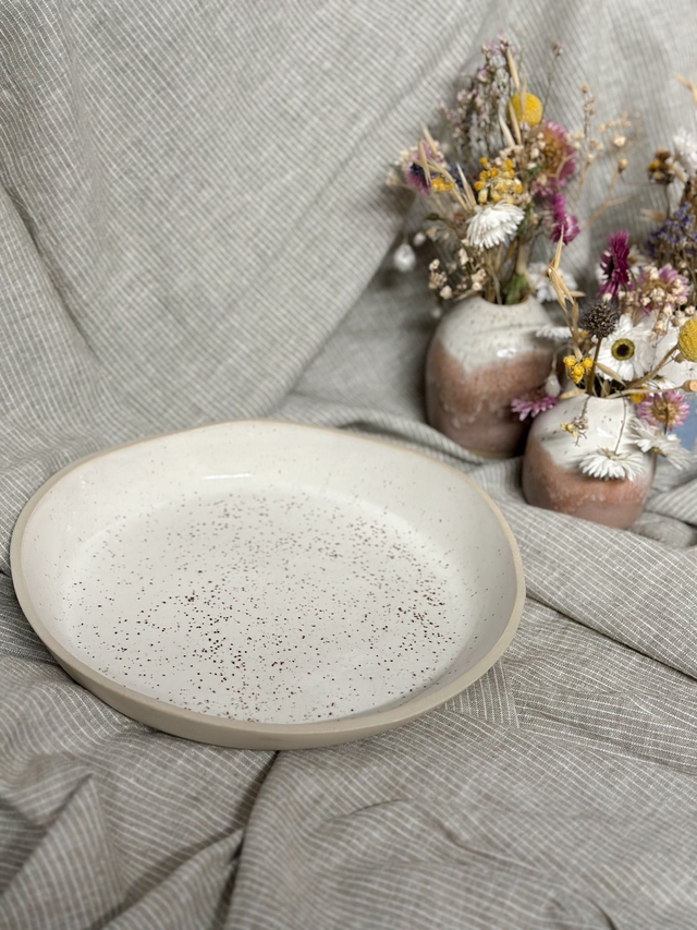 Handgefertigte Schale/Teller mit organischer Form und leicht erhöhtem Rand. Die weiß-glänzende Glasur ist mit feinen Spots versehen und verleiht dem Stück eine dezente, natürliche Struktur. Außen ist die Schale unglasiert. Durch die Form eignet sich die Schale sowohl als Teller als auch als Obstschale, Keksteller oder zum Servieren kleiner Speisen.