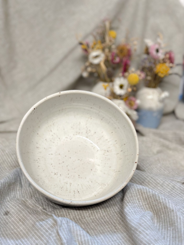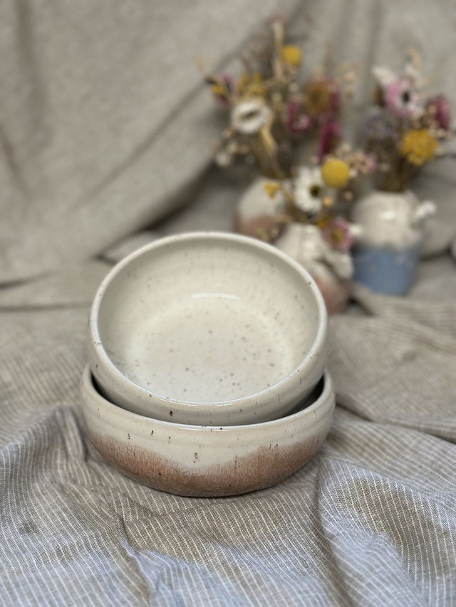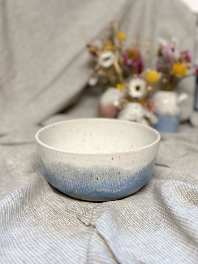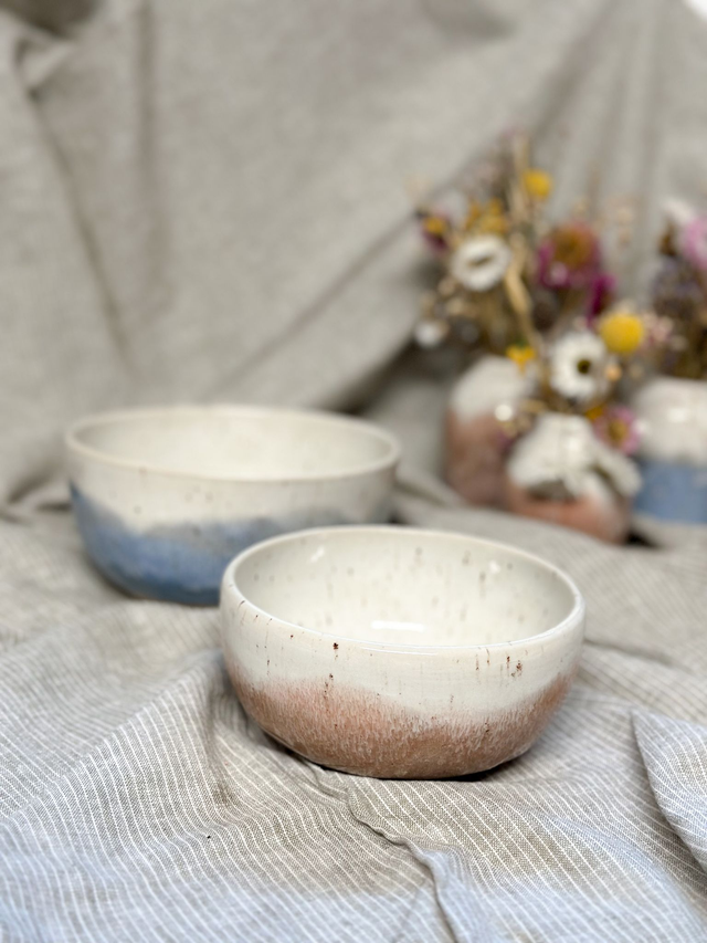 Handgefertigte Schüsseln aus Steinzeug. Im oberen Bereich und innen weiß-glänzende Glasur, im unteren Bereich hellblau / lachsrosa (matte Glasur). Ton ohne Spots. Spülmaschinengeeignet.