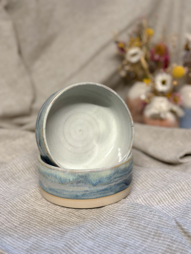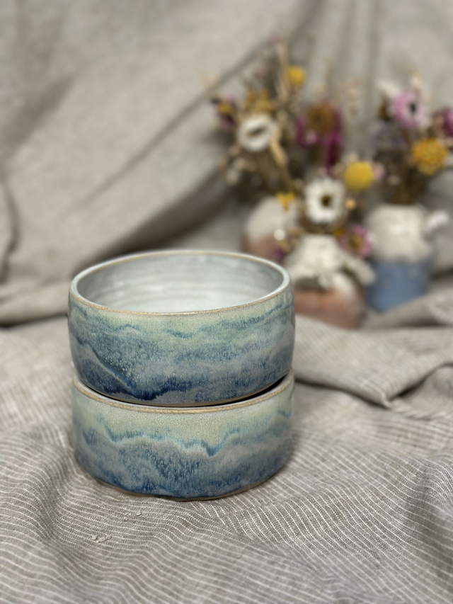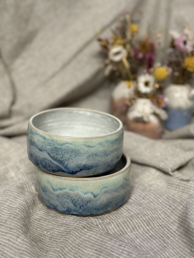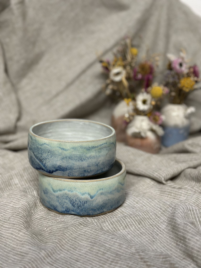 Handgefertigte kleine Schüssel aus Steinzeug, ideal für Müsli, Snacks, Dips oder kleine Beilagen. Wunderschöner grün-blauer Verlauf, mit oder ohne einem Streifen sichtbaren Tons.